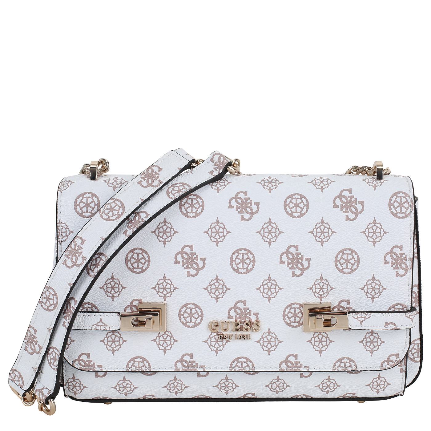 Сумка с ручками-цепочками Guess Loralee HWPG92 26210_white logo_pc - 2000558636865 белый полиуретан 27 x 16 x 7 Цена 14210 руб. купить в интернет-магазине PanChemodan.ru в Новосибирске
